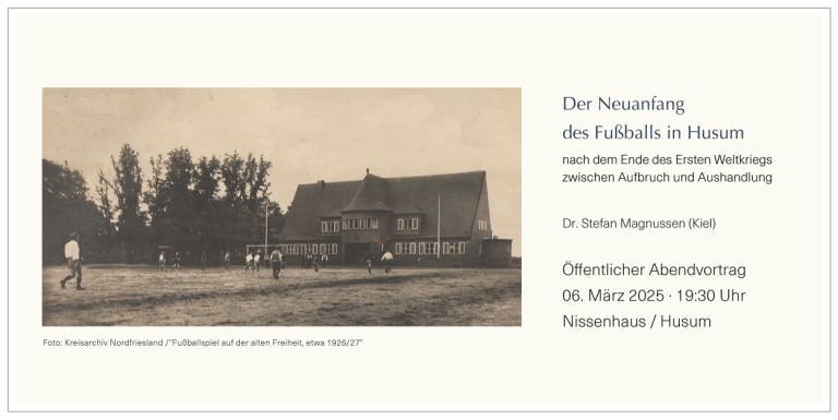 Der Vortrag gibt erstmals einen Einblick in die Anfangsjahre des Fußballs in Husum und schildert die Herausforderungen, vor denen der Spielbetrieb durch die Umstände der Zeit, aber auch vor Ort gestellt wurde. Auf diesem Wege entsteht ein ganz neuer Zugang zur Stadt- und Regionalgeschichte.