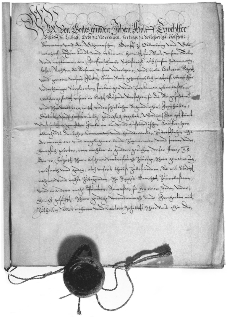 Erneute Bewidmung mit Weichbildrecht. Husum erhält eine eigene Gericht- und Polizeiordnung und wird Sitz eines Seegerichtes.